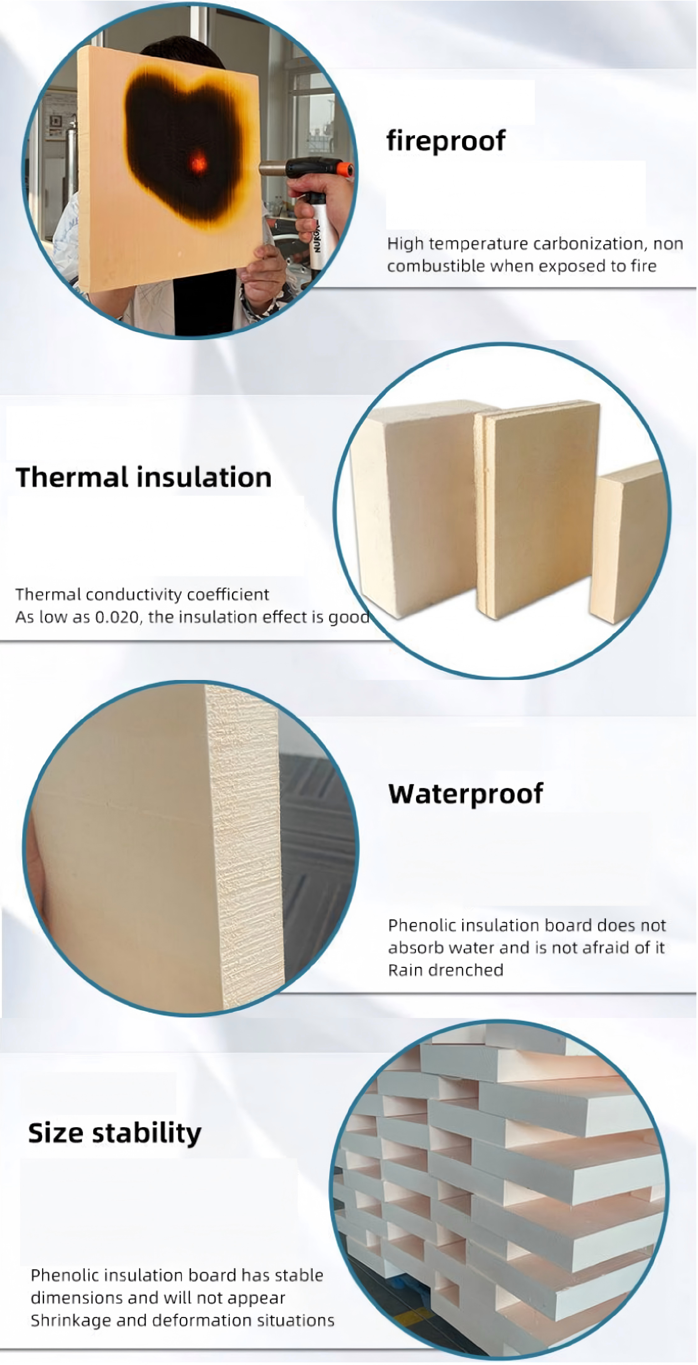 Phenolic foam material is flame-retardant, produces low smoke, and meets international fire safety standards. -